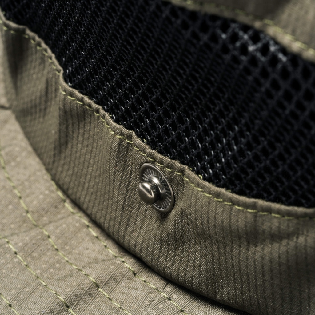 Kapelusz typu safari z bocznymi otworami wentylacyjnymi i regulowanym paskiem.