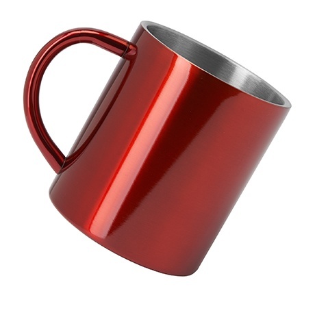 Metalowy kubek z podwójną ścianką, dostępny w różnych kolorach na zewnątrz.