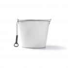 Metaliczne wiadro z dołączonym aluminiowym otwieraczem do butelek.