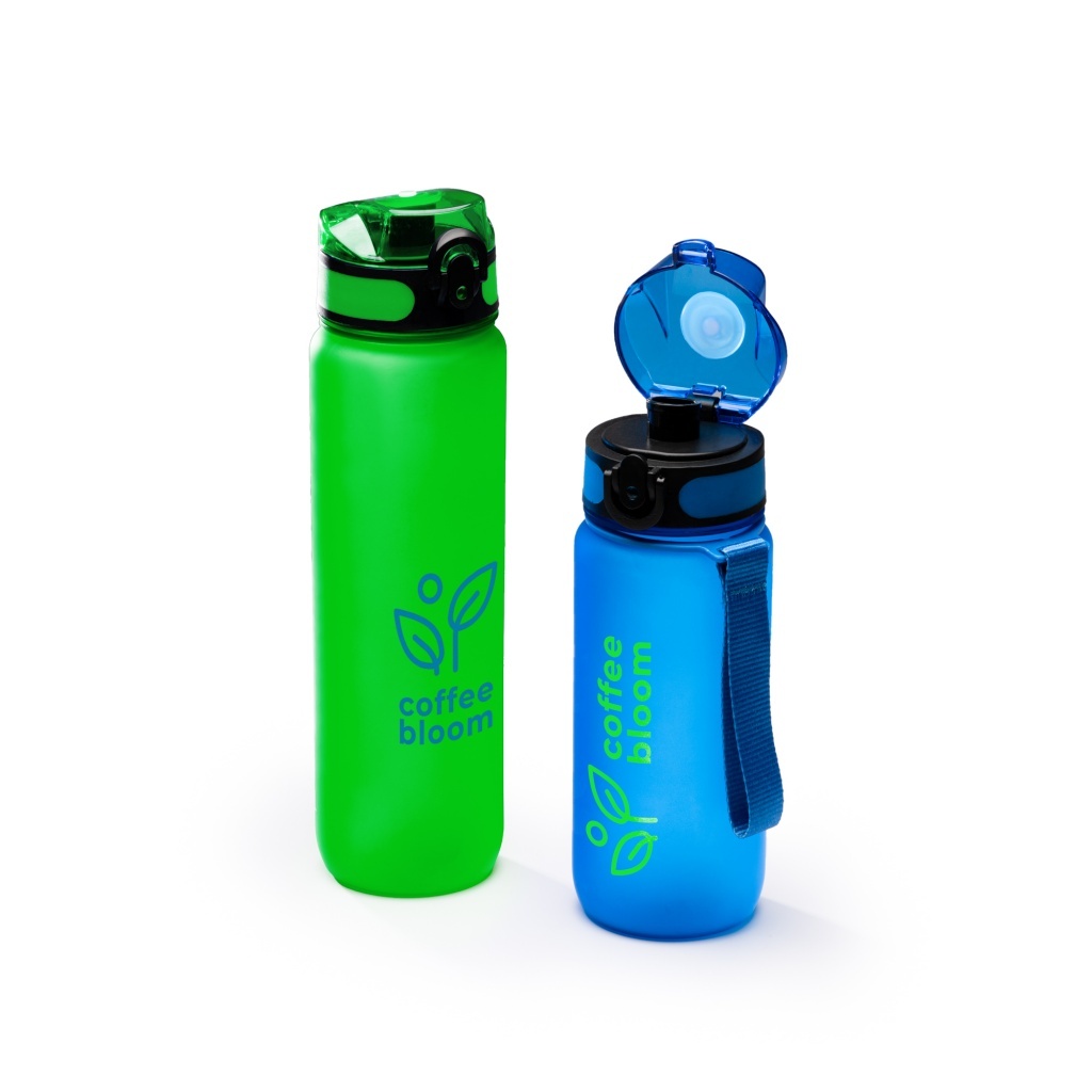 Butelka z tworzywa Tritan posiada półprzezroczysty korpus i dopasowaną zakrętkę z praktycznym uchwytem do przenoszenia. Na ściance znajdują się wskazówki dotyczące nawodnienia oraz oznaczenie pojemności, co ułatwia kontrolę przyjmowanej ilości płynów. Produkt łączy użyteczność z estetyką.