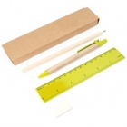 Zestaw 5-częściowy zapakowany w kartonik typu kraft; zawiera długopis w tekturowym korpusie i niebieskim tuszu, drewniany ołówek, temperówkę, gumkę oraz 15 cm. linijka.