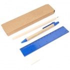 Zestaw 5-częściowy zapakowany w kartonik typu kraft; zawiera długopis w tekturowym korpusie i niebieskim tuszu, drewniany ołówek, temperówkę, gumkę oraz 15 cm. linijka.