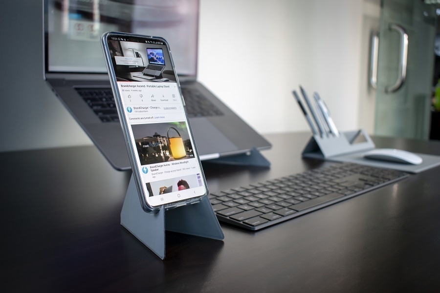 Stojak na telefon i tablet Ascend Mini zaprojektowano, aby stworzyć wygodne i funkcjonalne miejsce pracy w każdym miejscu.