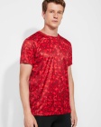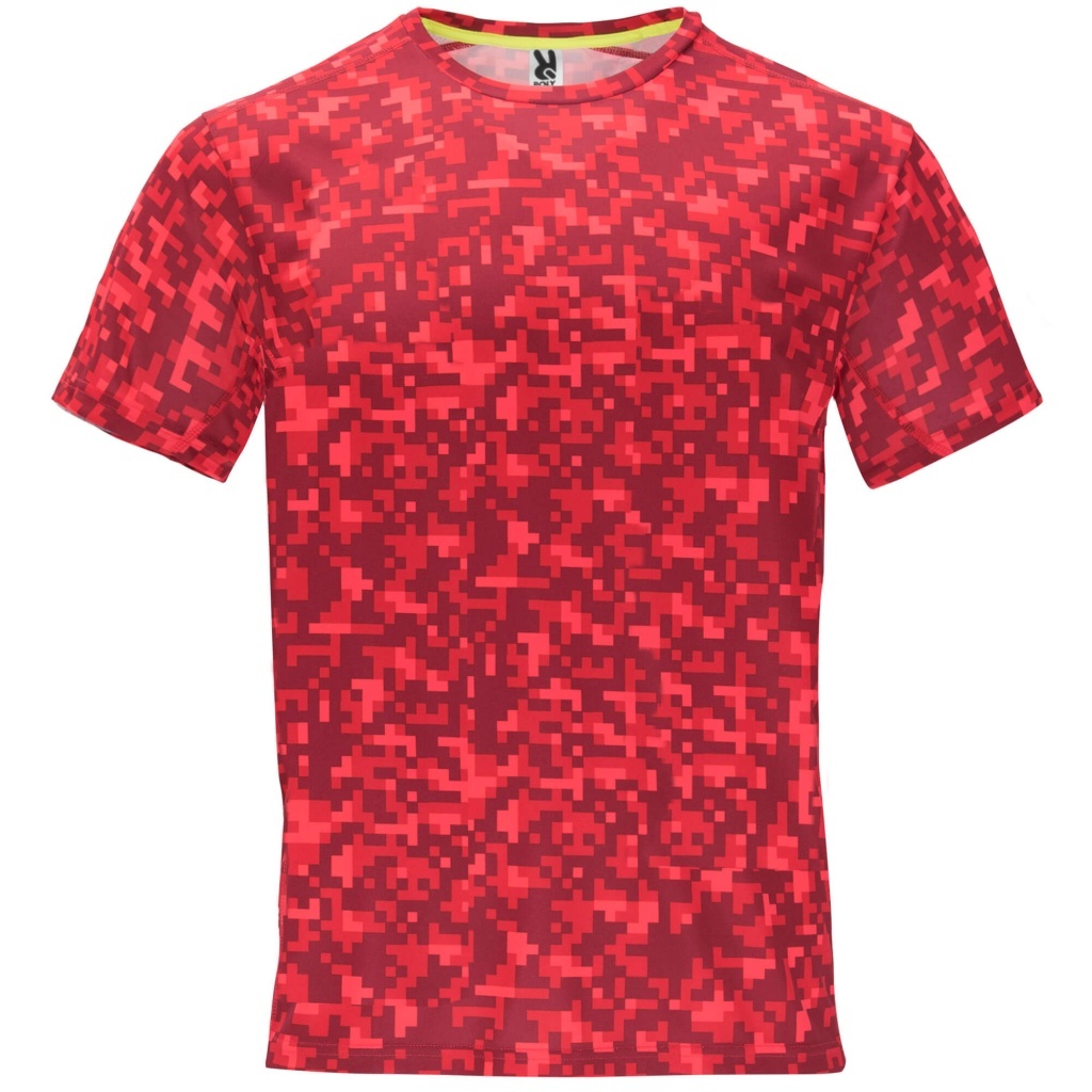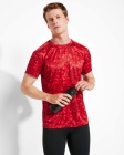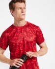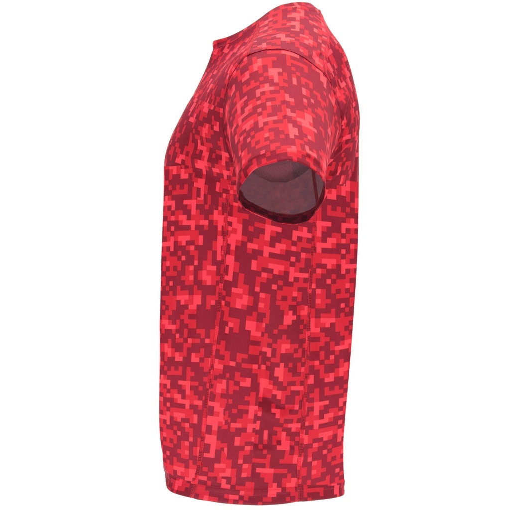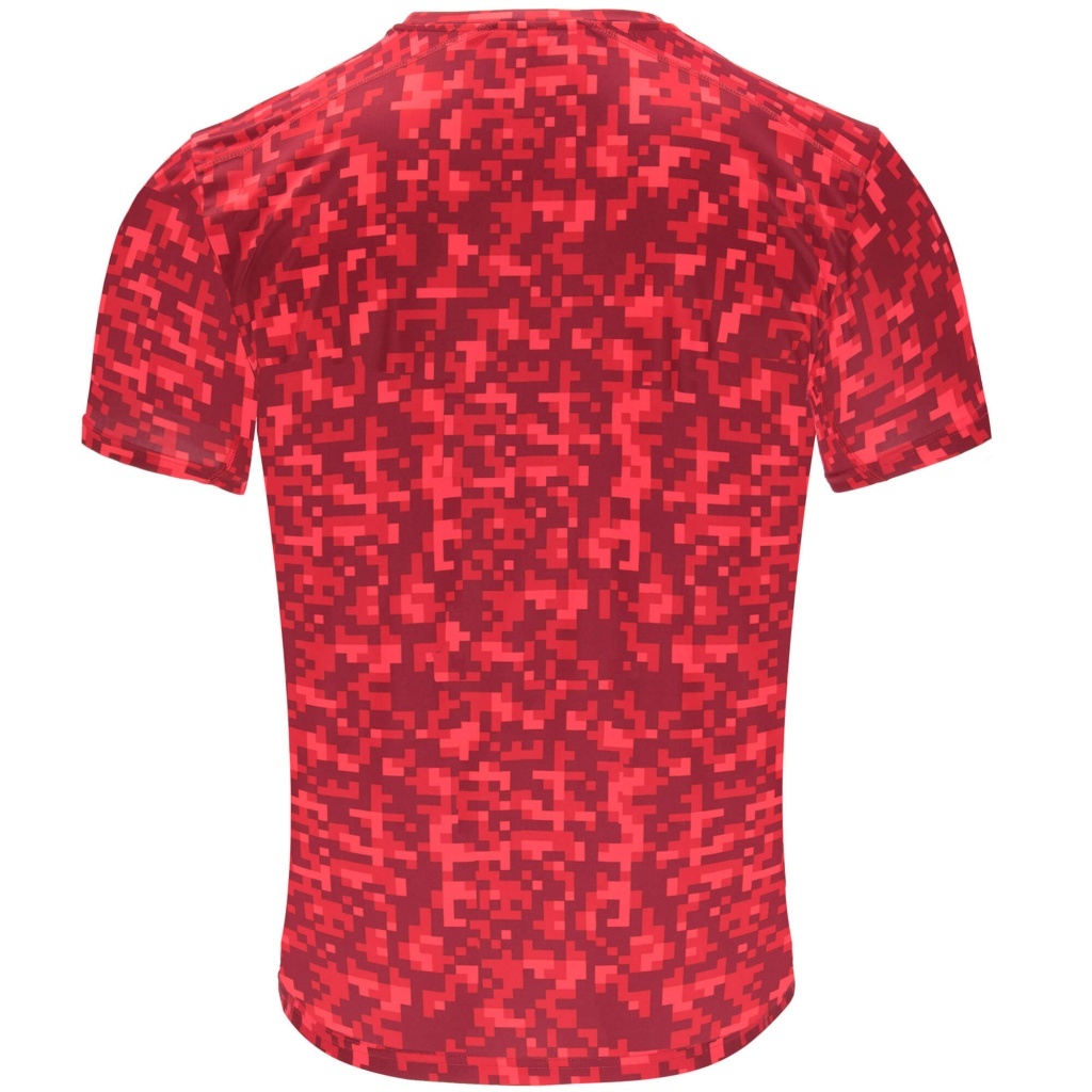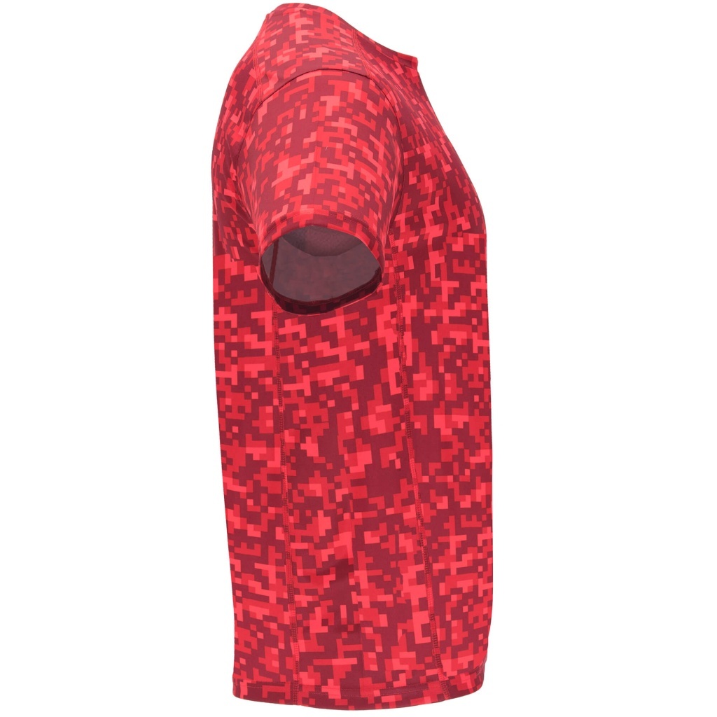 Techniczna koszulka we wzorki z krótkim rękawem z okrągłym dekoltem. Posiada wzmocnione, kryte szwy na karku w kolorze fluorescencyjnym oraz boczne i pachowe panele w tym samym kolorze.