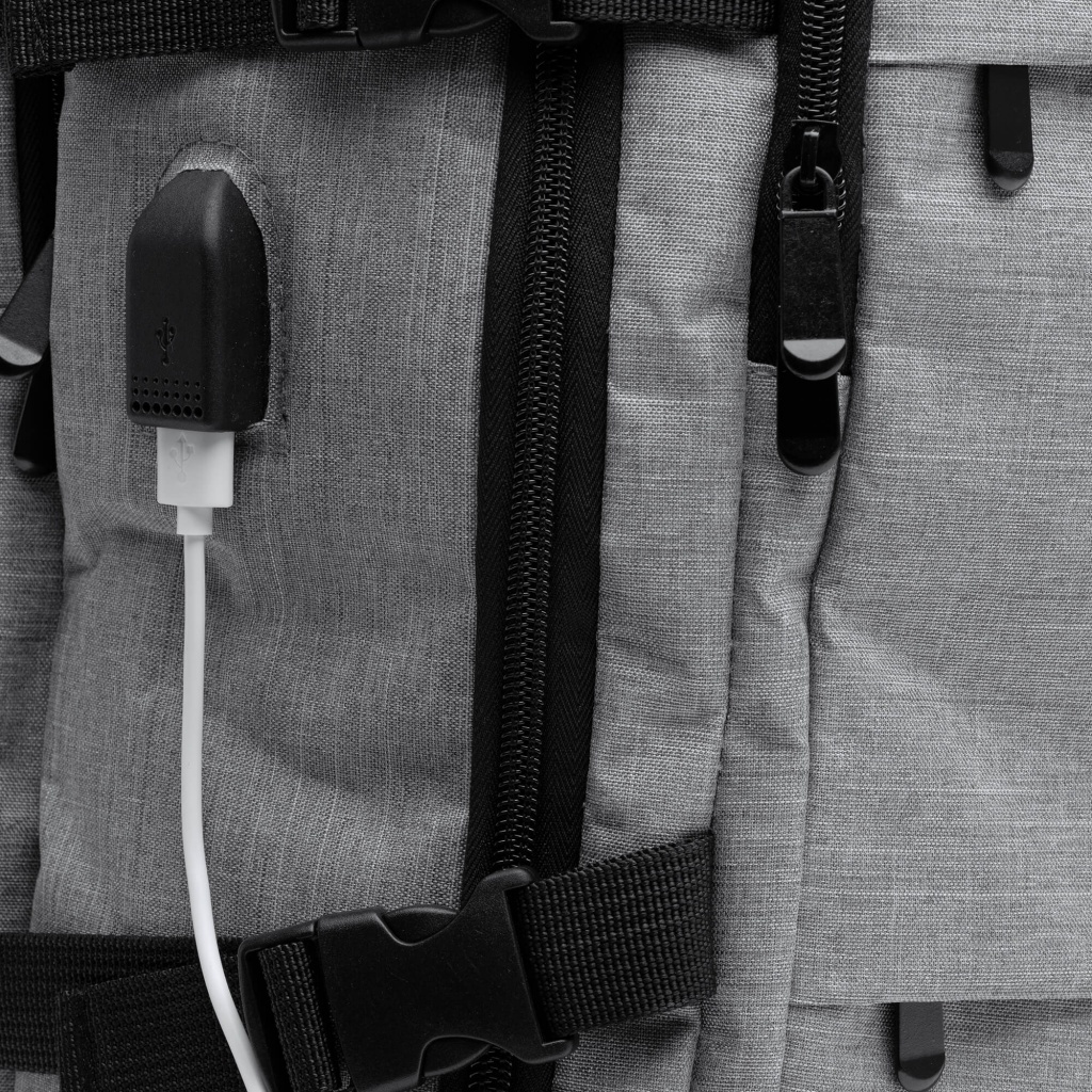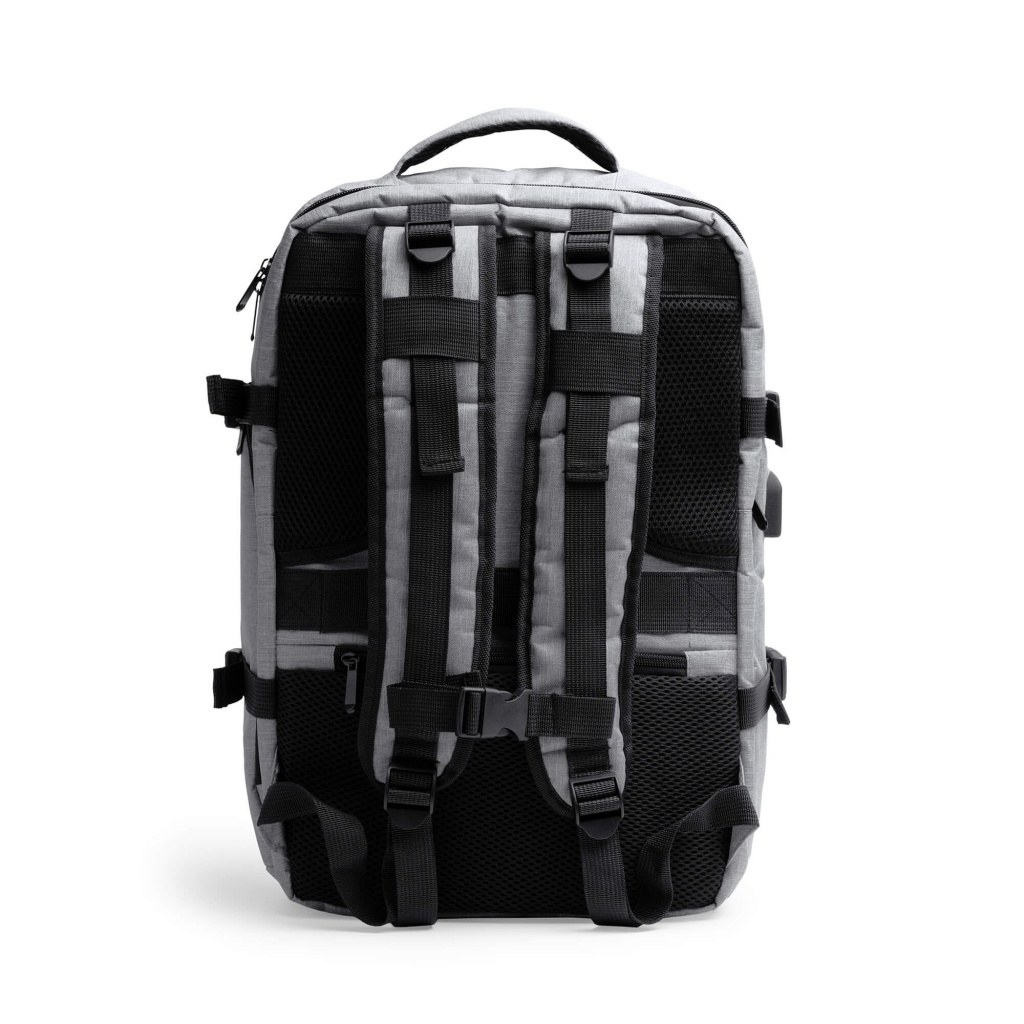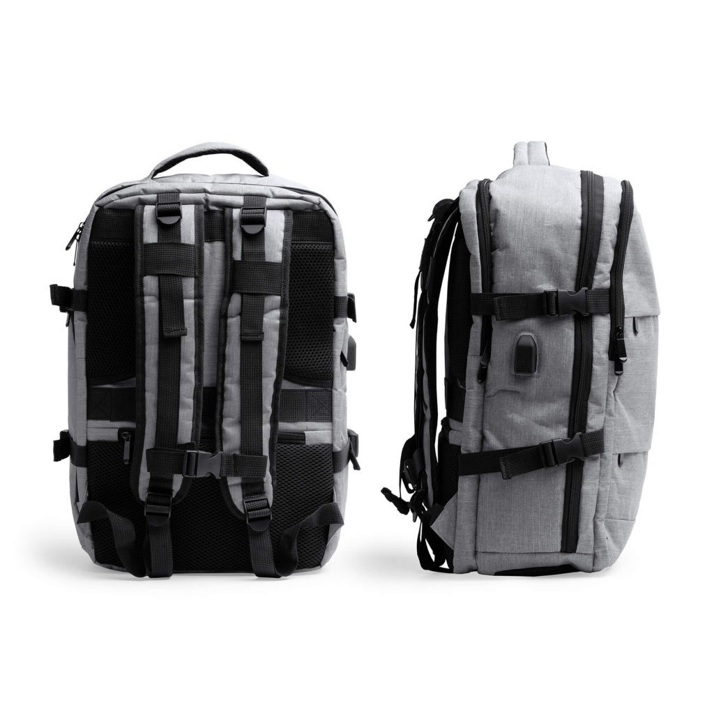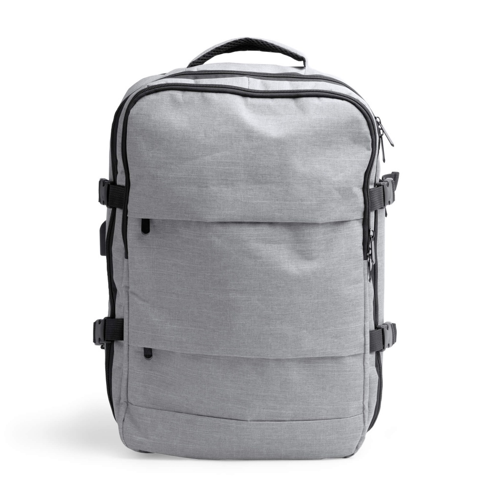 Plecak podróżny z poliestru RPET z recyklingu, zaprojektowany z naciskiem na komfort i funkcjonalność. Wyposażony w wyściełane plecy i uchwyty, dwie przednie kieszenie zewnętrzne oraz trzy obszerne przegrody główne. Zawiera wyściełaną kieszeń na laptopa 17,3”, port USB z przewodem micro USB do podłączenia powerbanka (brak w zestawie), wentylowaną przegrodę na obuwie oraz tylną kieszeń antykradzieżową i pasek do mocowania.