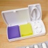 Praktyczne pudełko na pigułki z dwiema sekcjami — jedna zawiera dwa dwukolorowe pojemniki, druga wyposażona jest w nóż do dzielenia tabletek o większej objętości, co ułatwia przechowywanie i dawkowanie leków.