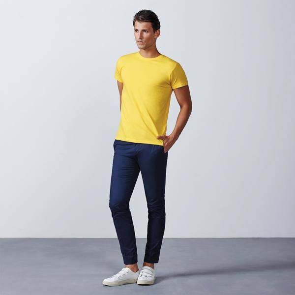 T-shirt z krótkim rękawem, podwójny karczek. Wzmacniane, kryte szwy na karku i ramionach. Brak szwów bocznych. Zaokrąglony ściągacz przy szyi.