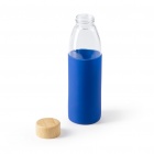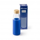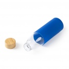 Elegancki szklany bidon wyposażony w bambusową nakrętkę oraz kolorową silikonową osłonę.