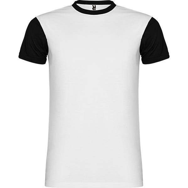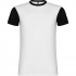 T-shirt z krótkim rękawem, zaokrąglony kołnierzyk wykończony lamówką w kolorze czarnym. Rękawki w kolorze czarnym wykonane z tego samego materiału. Koszulka wykonana z tkaniny poliestrowej przypominającej w dotyku bawełnę.