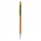 Długopis o korpusie i przycisku z bambusa, z miękko wykończonymi, kolorowymi detalami. Metalowa końcówka i klips. Atrament w kolorze niebieskim.