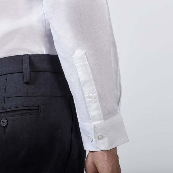 Męska koszula z kieszonką po lewej stronie piersi. Zapięcie na przedzie z ukrytymi guziczkami. Kołnierzyk zapinany na guziczki. Mankiety z dwoma guzikami.