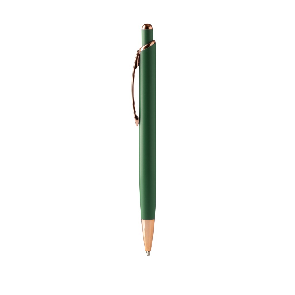 • Perla - Długopis z matową, metalową konstrukcją i detalami o miedzianym wykończeniu. Wkład Jumbo z niebieskim atramentem.