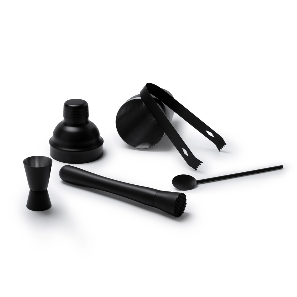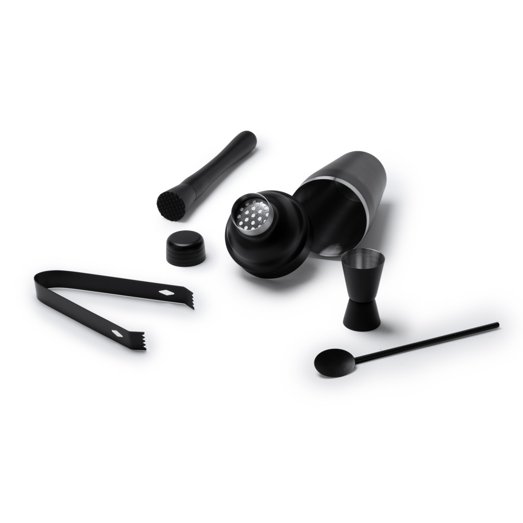 Kompletny zestaw barmański ze stali nierdzewnej 304: miarka, shaker 550 ml, szczypce, łyżka i rozdrabniacz. Produkt zapakowany w eleganckie pudełko.