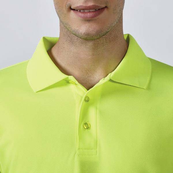 Techniczna, dobrze widoczna koszulka polo z krótkimi rękawami, zaprojektowana z kołnierzem prążkowanym 1x1, zapięciem na 3 guziki oraz dwoma poziomymi paskami o wysokiej widoczności na piersi i rękawach. Materiał odporny na zaciągnięcia zapewnia trwałość podczas intensywnego użytkowania.