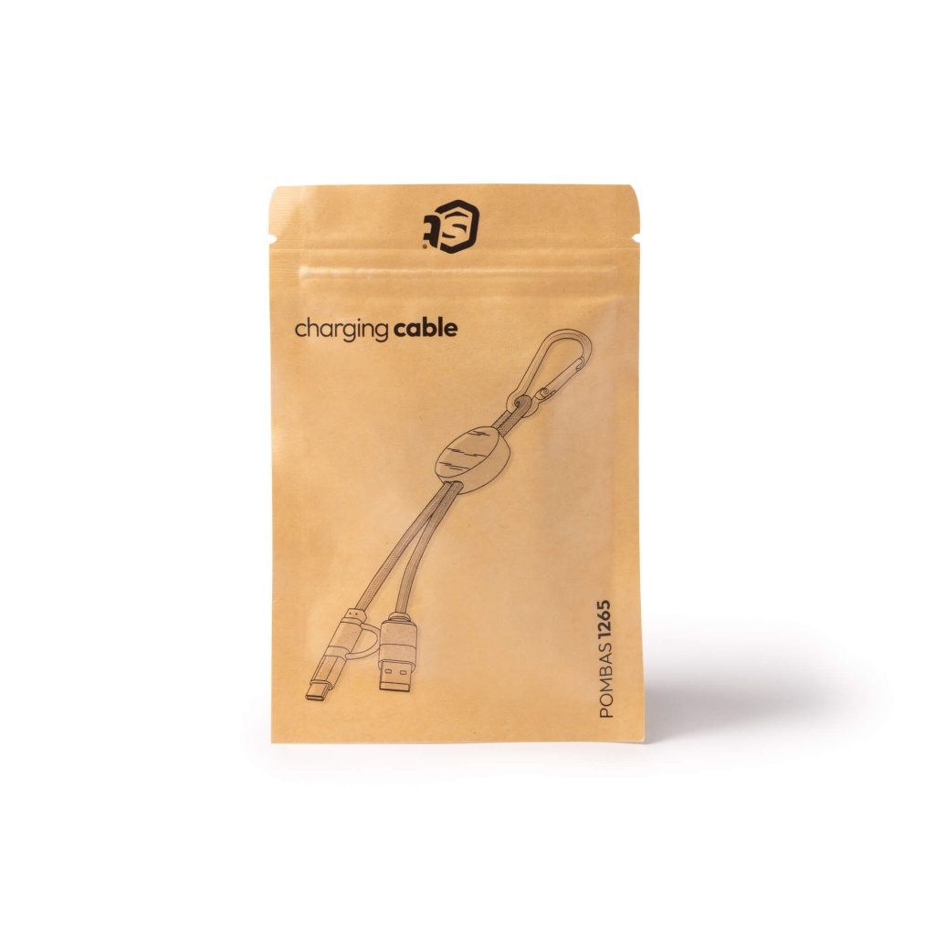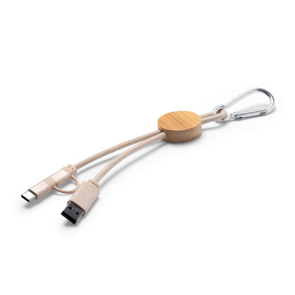 Kabel 4 w 1. Główna konstrukcja z bambusa, przewód z bawełny oraz elementy z włókna pszenicznego. Zawiera złącza USB, USB typu C oraz Lightning. W zestawie znajduje się krabińczyk. Produkt zapakowany w osobną torbę zaprojektowaną z myślą o środowisku.