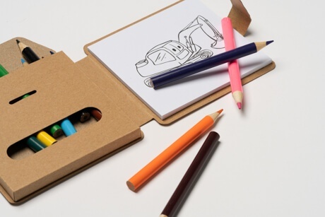 Zestaw plastyczny dla dzieci zawierający blok rysunkowy z 36 arkuszami o różnych wzorach oraz komplet 12 kolorowych kredek.