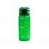 Półprzezroczysta butelka z tworzywa Tritan, wyposażona w wygodny uchwyt do przenoszenia oraz praktyczny wskaźnik poziomu płynu i oznaczenia ułatwiające kontrolę nawodnienia.