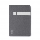 Notatnik A5 z twardą okładką wykonaną z materiału RPET. W komplecie długopis i uchwyt na komórkę. 80 gładkich kartek.