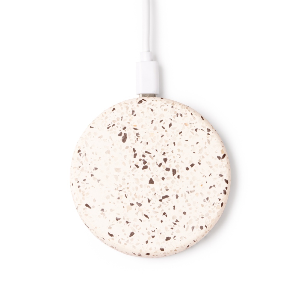 Bezprzewodowa ładowarka z obudową wykonaną z bambusa oraz lastriko pochodzącego z recyklingu.