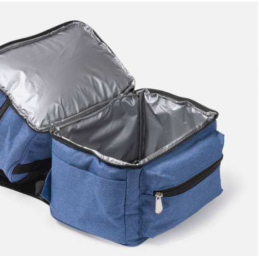 Termiczny plecak wykonany z tkaniny 300D RPET, wyposażony w dwie komory: górną z trzema wewnętrznymi kieszeniami oraz dolną z izotermicznym wnętrzem. Posiada przednią kieszeń zapinaną na zamek błyskawiczny, dwie boczne kieszenie oraz wyściełane uchwyty.