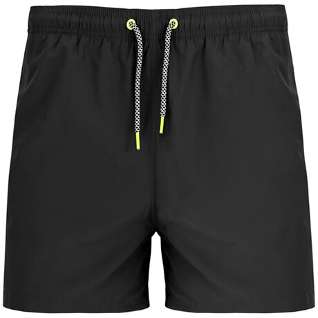 Krótkie spodenki plażowe z dwoma kieszeniami bocznymi. Pas elastyczny z kontrastującym, regulowanym sznurkiem oraz metalowymi oczkami przy kieszeniach. Boczne kieszenie obszyte lamówką. Tylnia kieszeń posiada otwór odpływowy.