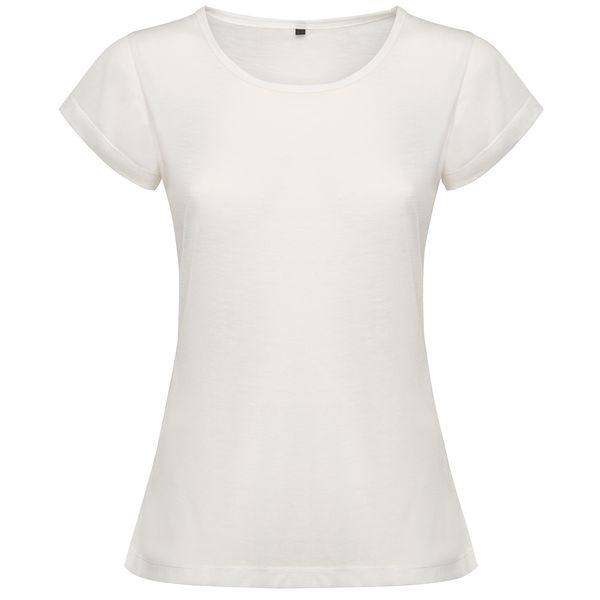 Dopasowana koszulka z krótkim rękawem. Okrągły kołnierzyk wykonany z tej samej tkaniny, szwy boczne. Wykonana z poliestrowej tkaniny o właściwościach przypominających bawełnę.