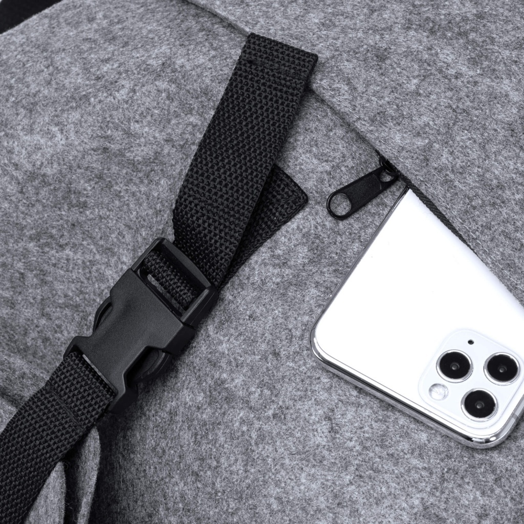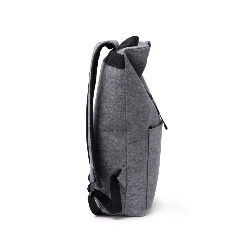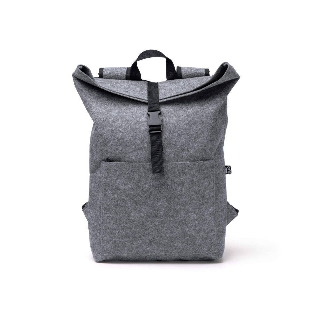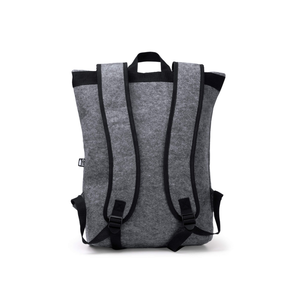 Plecak z filcu z recyklingu z klapą, zamykany, z przednią kieszenią oraz regulowanymi szelkami.