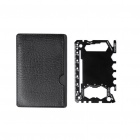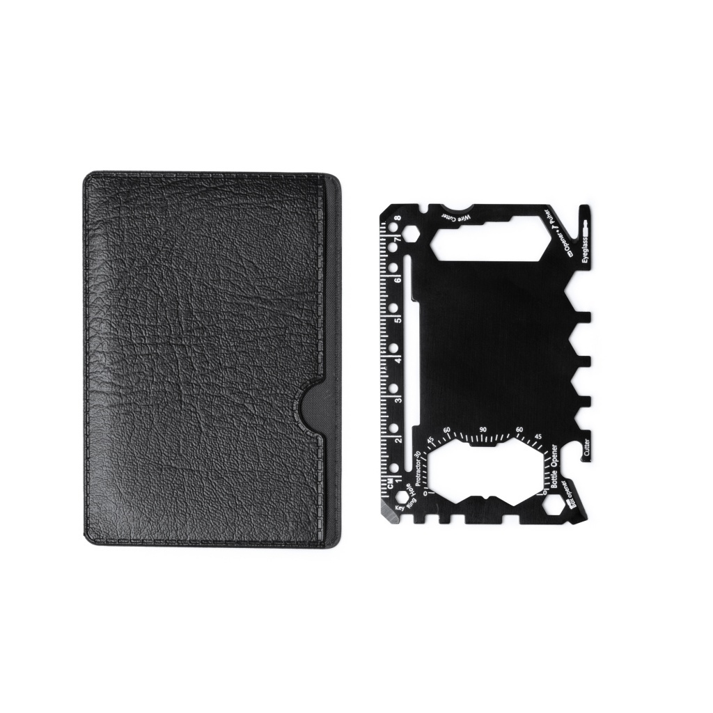 Narzędzie wielofunkcyjne ze stali nierdzewnej, wyposażone w 17 wbudowanych funkcji. Kompaktowe narzędzie obejmuje: otwieracz do puszek, ostry nóż, śrubokręt, linijkę, otwieracz do butelek, klucz nastawny, klucz motylkowy, piłę, kierunkowskaz i kątomierz. Produkt zapakowany w etui wykonane z PU.