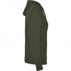 Bluza z kapturem o dopasowanym kroju. Kontrastowe wykończenie wnętrza kaptura oraz dopasowany kolorystycznie sznurkowy ściągacz. Kieszeń typu kangurka. Wzmocnione szwy na karku. Elastyczne ściągacze mankietów i talii wykończone lamówką 1x1.