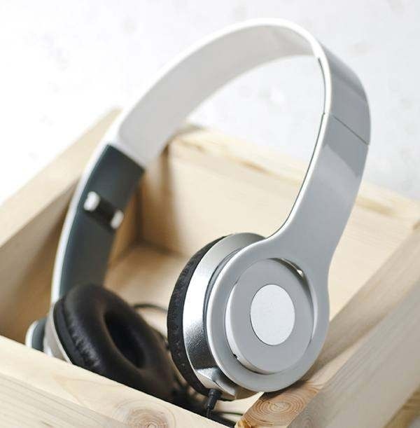 Składane, przewodowe słuchawki o smukłej konstrukcji, wyposażone w wygodne nauszniki i błyszczące wykończenie.