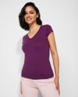 Damska koszulka z krótkim rękawem i dekoltem wykończonym w szpic (V-neck). Szwy boczne. Dopasowany krój.