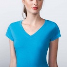 Damska koszulka z krótkim rękawem i dekoltem wykończonym w szpic (V-neck). Szwy boczne. Dopasowany krój.