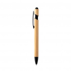 Długopis z korpusem i przyciskiem z naturalnego bambusa. Elementy dekoracyjne w kolorze z chromowanym efektem oraz dopasowany wskaźnik dotykowy. Wyposażony w pojemny wkład z niebieskim atramentem, zapewniający płynne pisanie i dłuższą żywotność.