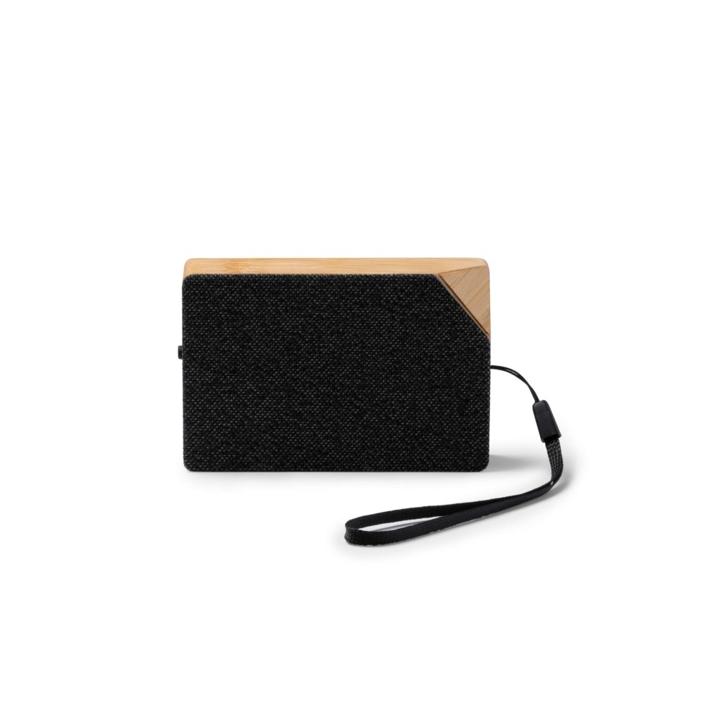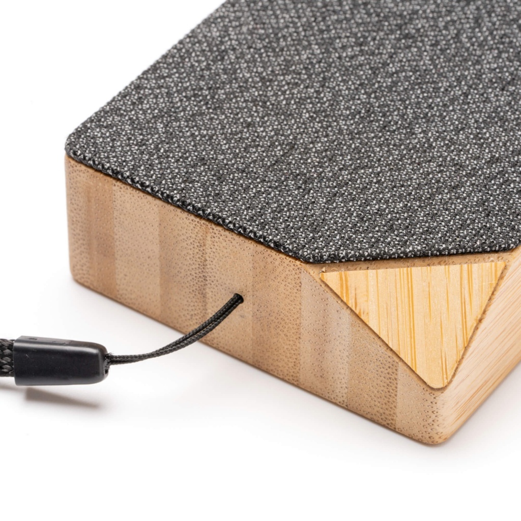 Bezprzewodowy głośnik z powierzchnią wykonaną z poliestru RPET pochodzącego z recyklingu i bambusowym korpusem, zasilany energią słoneczną, o mocy 3 W. Wyposażony w wygodny uchwyt do przenoszenia oraz złącze Typu C z dołączonym kablem. Idealny do słuchania muzyki w podróży, łączy funkcjonalność z zasadami zrównoważonego rozwoju. Dostarczany w ekologicznie zaprojektowanym pudełku, przeznaczony dla osób poszukujących przyjaznego dla środowiska i wydajnego akcesorium technologicznego.