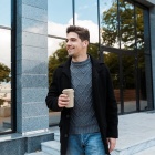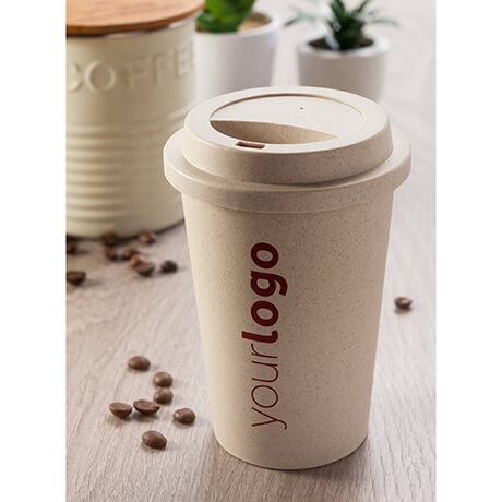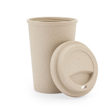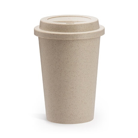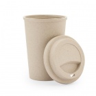 Kubek wykonany z włókna bambusowego i PP, wyposażony w odkręcaną pokrywkę.
