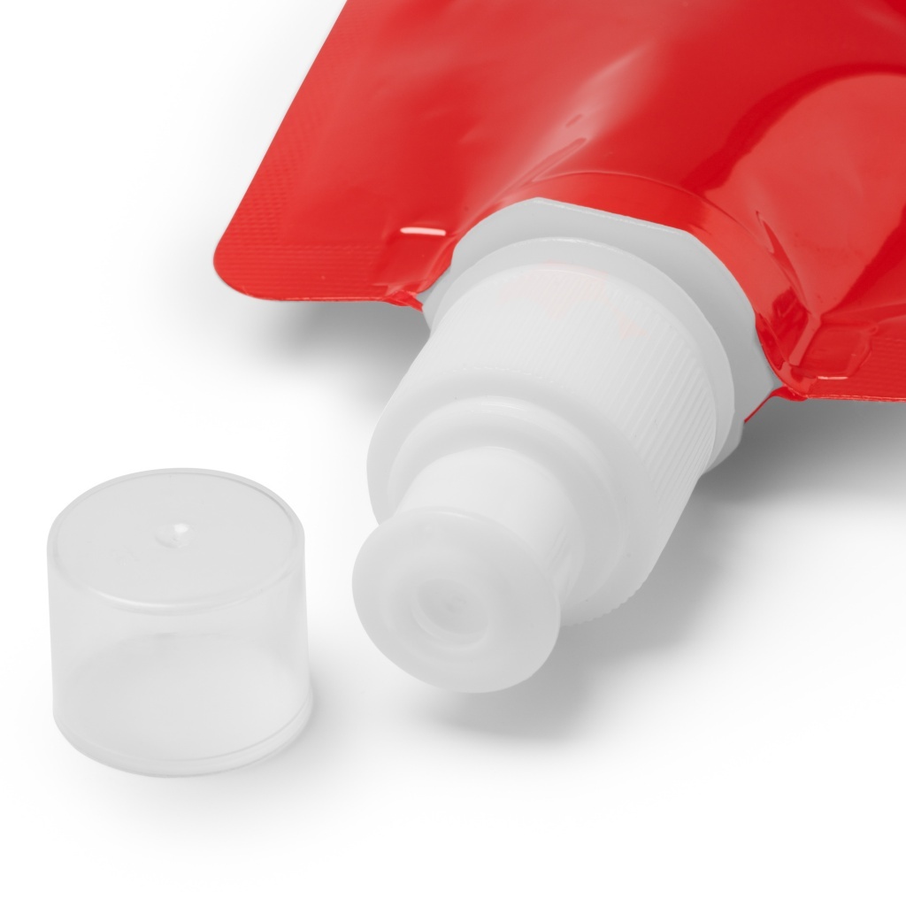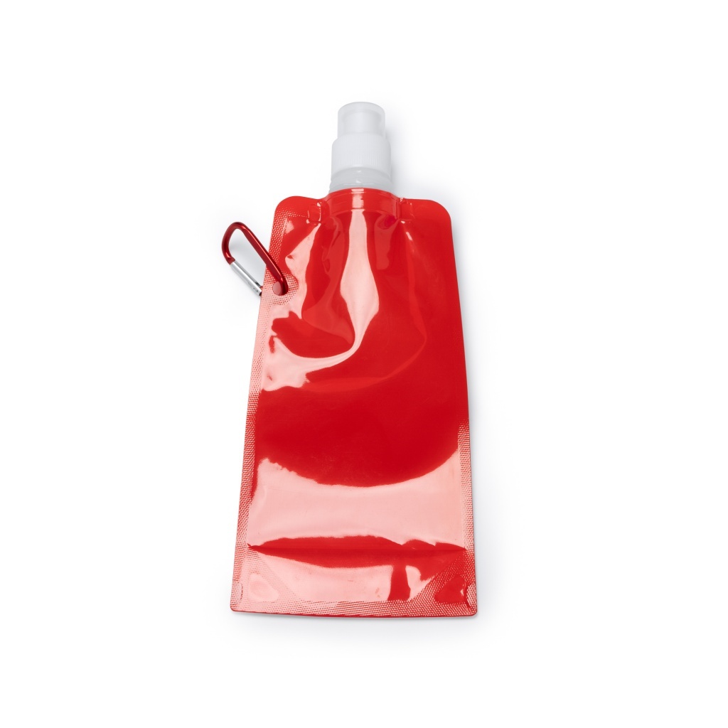 Składana butelka z zakrętką i aluminiowym karabińczykiem — lekka, poręczna i zajmująca niewiele miejsca w plecaku.