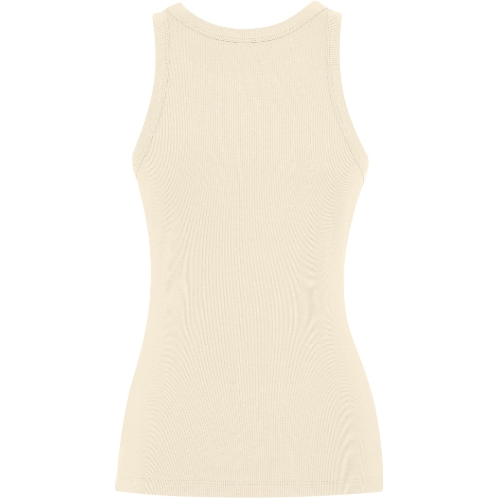Damska koszulka na ramiączkach wykonana z prążkowanego materiału. Kołnierz oraz wycięcia na ramionach wykończone szerokim pasem z tego samego materiału, wzmocnione podwójnym szwem. Dół również wykończony podwójnym szwem.
