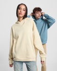 Uniseksowa bluza dresowa w kroju oversize, z kapturem wykończonym tą samą tkaniną. Na karku miękka taśma kryjąca przeszycie. Dwie kieszenie boczne. Mankiety i obszycie z prążków 2x1.