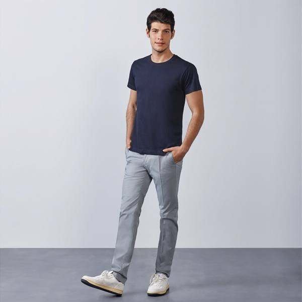 T-shirt z krótkim rękawem. Podwójna tkanina z dodatkiem elastanu przy kołnierzu. Brak szwów bocznych w wersji dla dorosłych, szwy boczne w wersji dziecięcej. Wzmocnione, kryte szwy przy karczku.