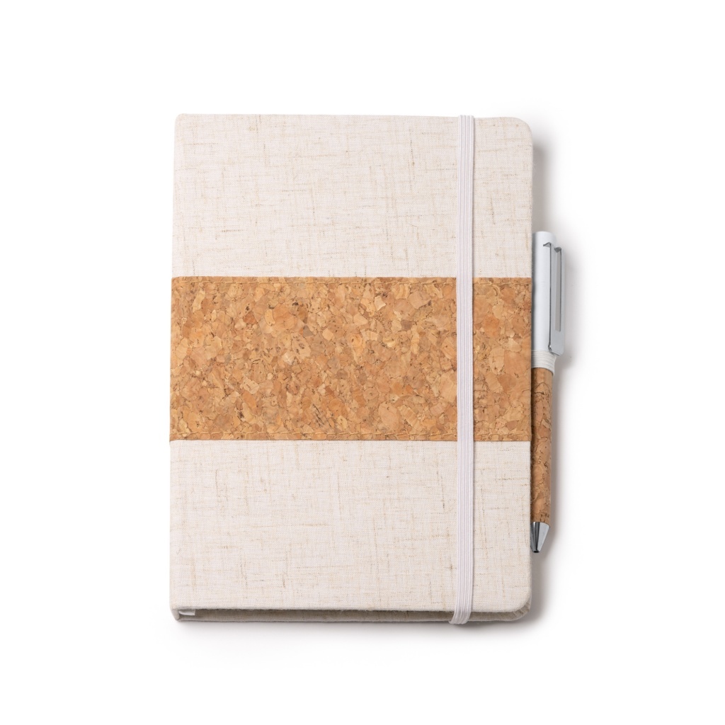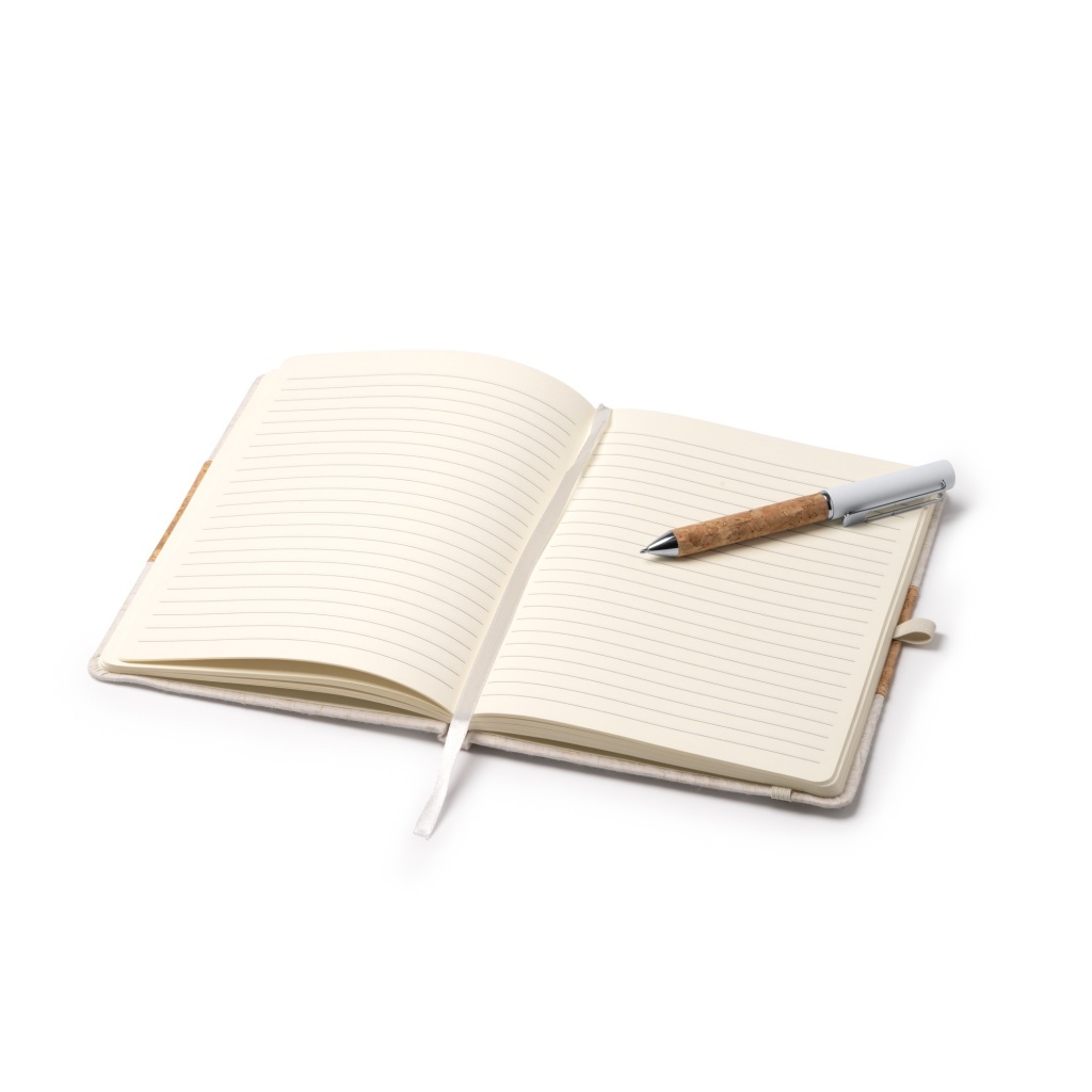 Komplet zawiera notes w formacie A5 oraz długopis, zapakowane w etui wykonane z tektury kraftowej. Notes posiada twardą okładkę z bawełny i korka oraz 80 kartek w linie. Metalowy długopis wyposażony w korkowy uchwyt. Atrament w kolorze niebieskim.
